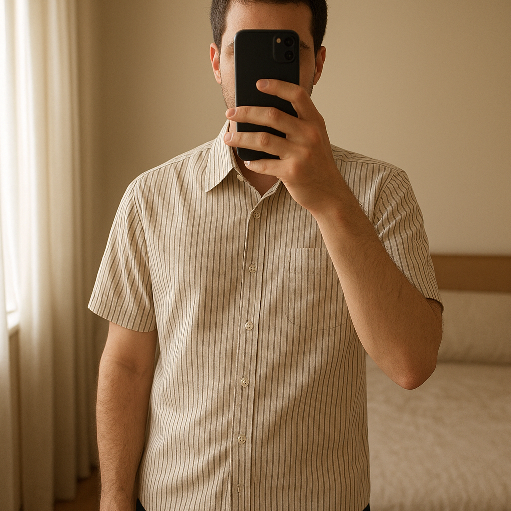 Chemise rayé taille 5 debout, face à la caméra, dans une chambre à la lumière douce, avec une lumière naturelle filtrant par la fenêtre.
