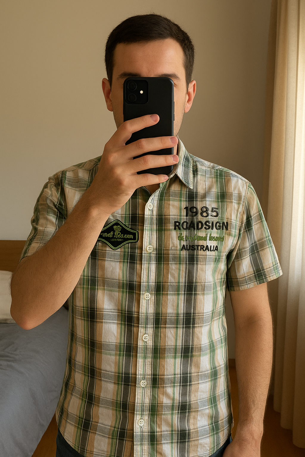 Chemise Roadsign taille M debout, face à la caméra, dans une chambre à la lumière douce, avec une lumière naturelle filtrant par la fenêtre.