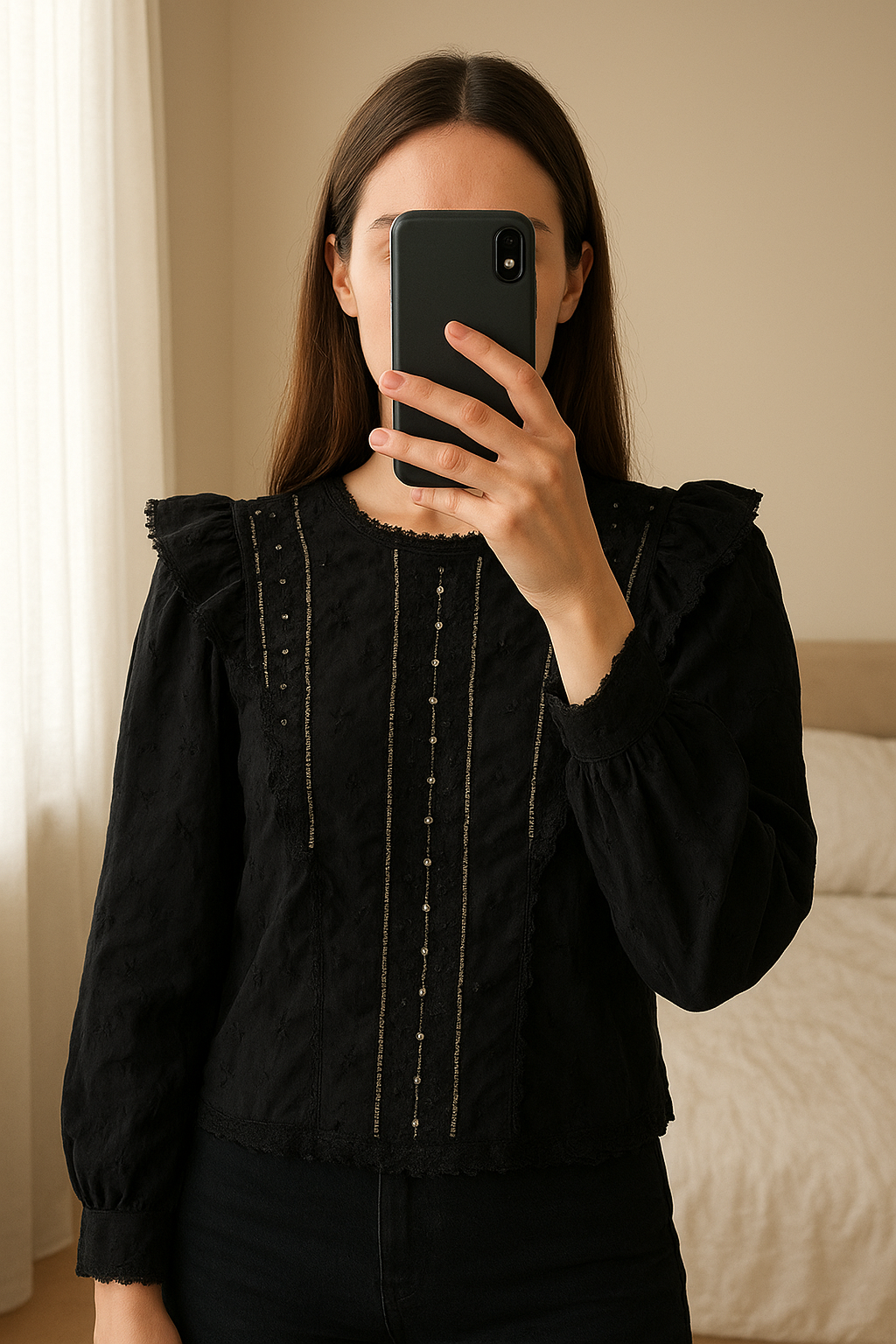 Chemise à sequins Zara debout, face à la caméra, dans une chambre à la lumière douce, avec une lumière naturelle filtrant par la fenêtre.