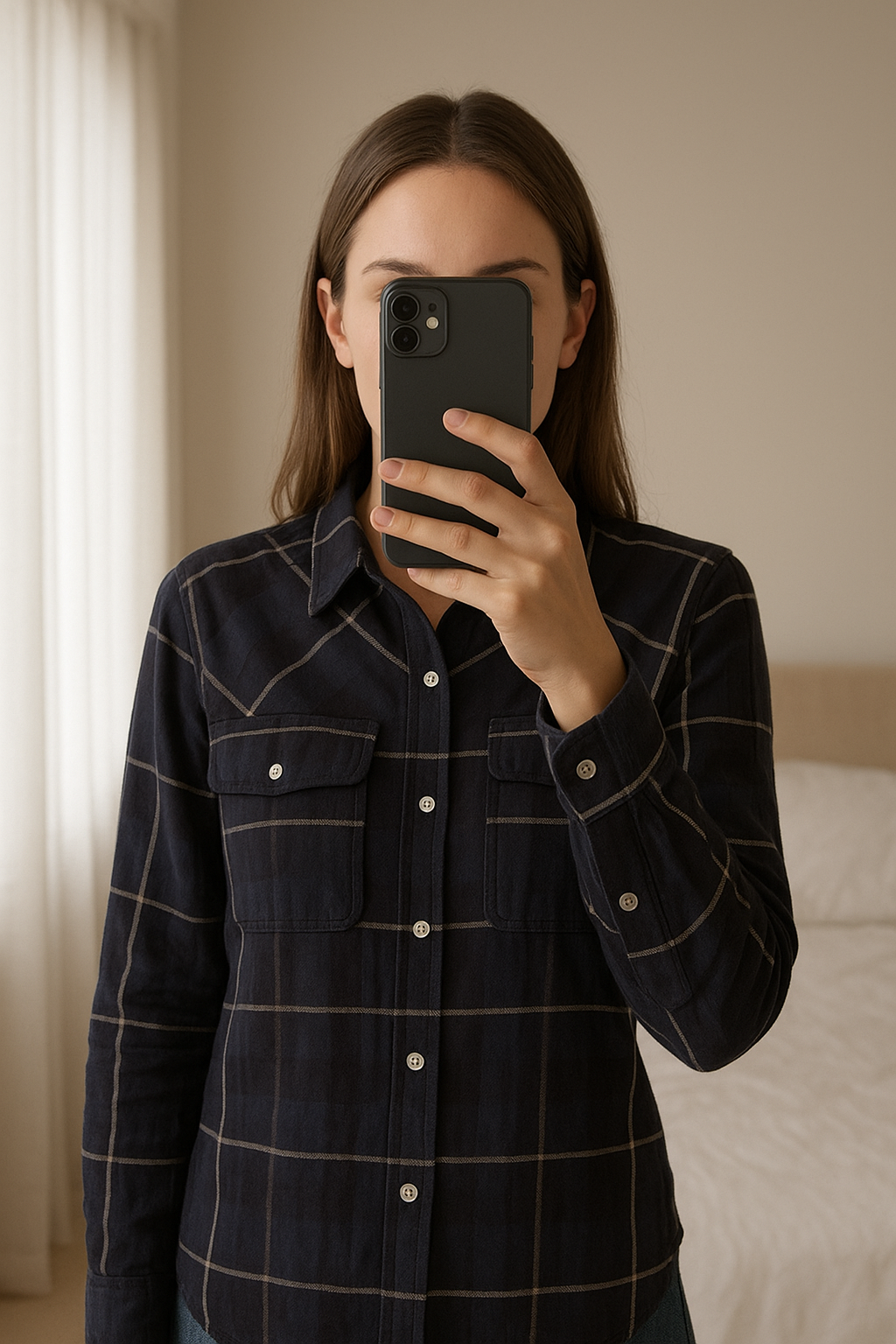 🛑chemise🛑T.40 debout, face à la caméra, dans une chambre à la lumière douce, avec une lumière naturelle filtrant par la fenêtre.