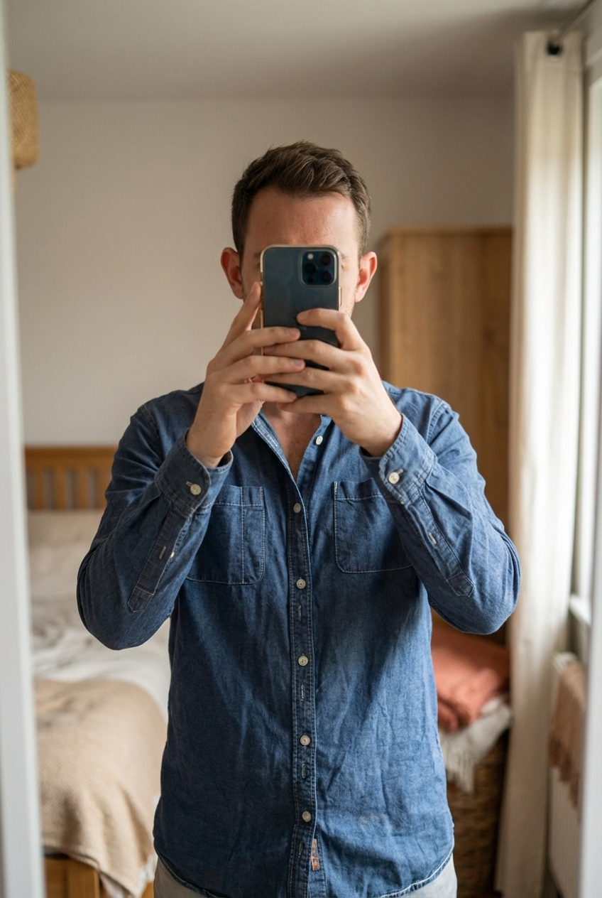 Chemise taille L Jules debout, face à la caméra, dans une chambre à la lumière douce, avec une lumière naturelle filtrant par la fenêtre.