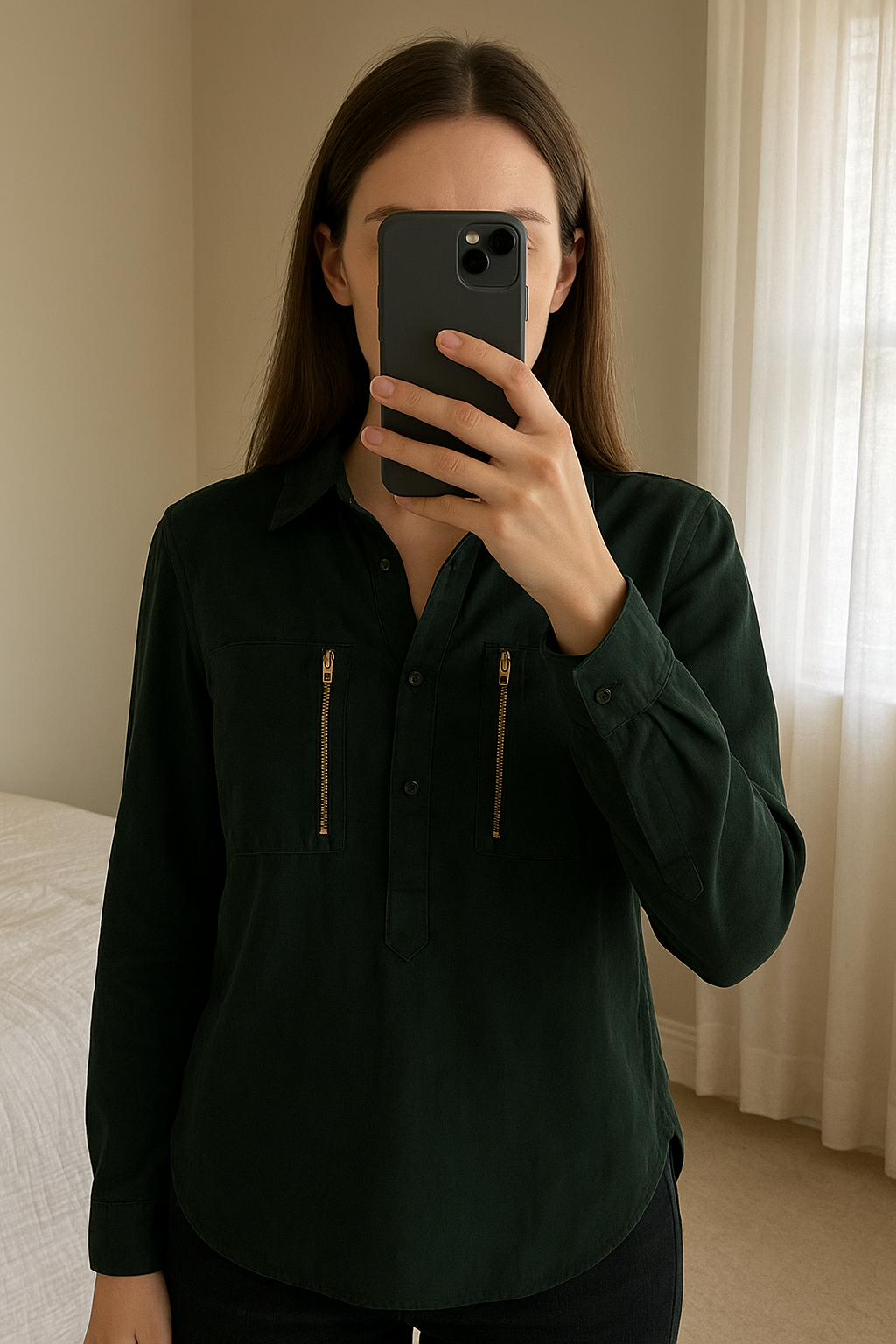 Chemise vert foncé Zara debout, face à la caméra, dans une chambre à la lumière douce, avec une lumière naturelle filtrant par la fenêtre.
