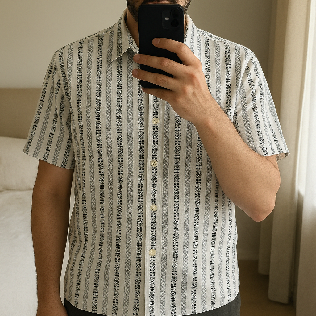 Chemise vintage debout, face à la caméra, dans une chambre à la lumière douce, avec une lumière naturelle filtrant par la fenêtre.