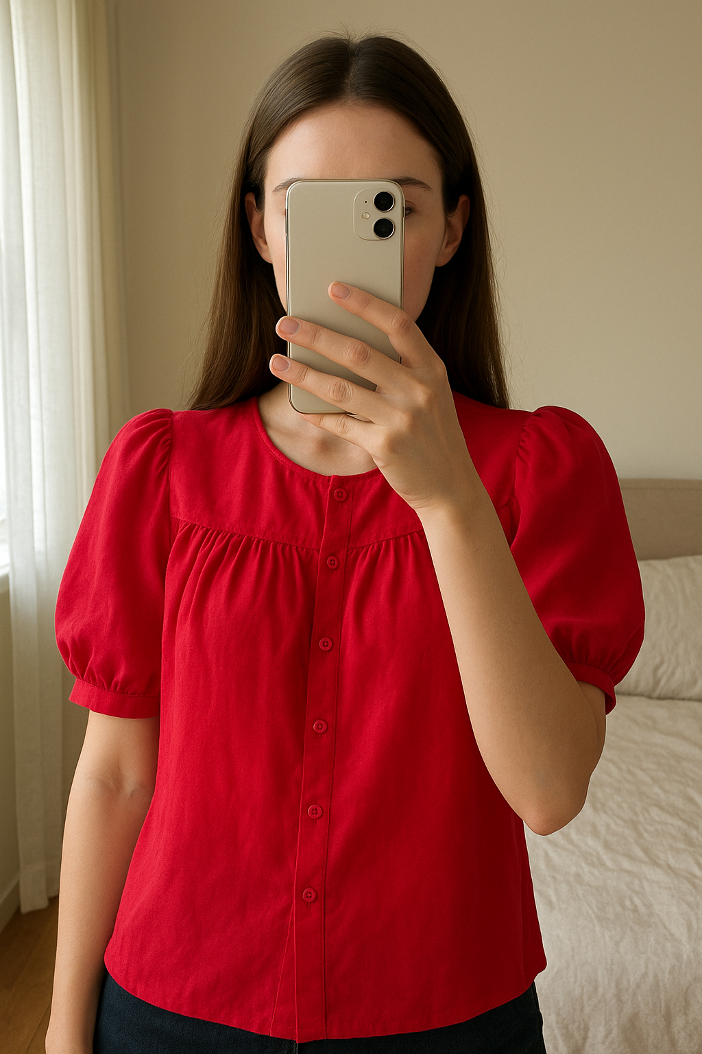 Chemise vintage rouge femme XL rétro chic manches courtes fluide debout, face à la caméra, dans une chambre à la lumière douce, avec une lumière naturelle filtrant par la fenêtre.