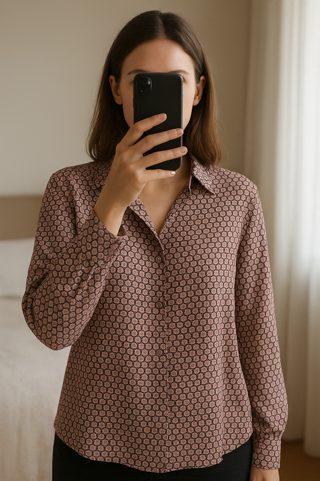 Chemise Zara debout, face à la caméra, dans une chambre à la lumière douce, avec une lumière naturelle filtrant par la fenêtre.