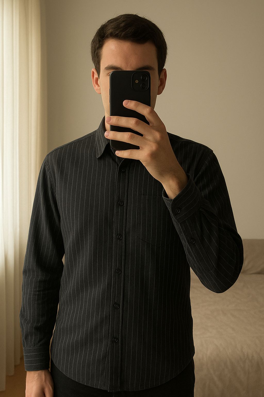 Chemise zara debout, face à la caméra, dans une chambre à la lumière douce, avec une lumière naturelle filtrant par la fenêtre.