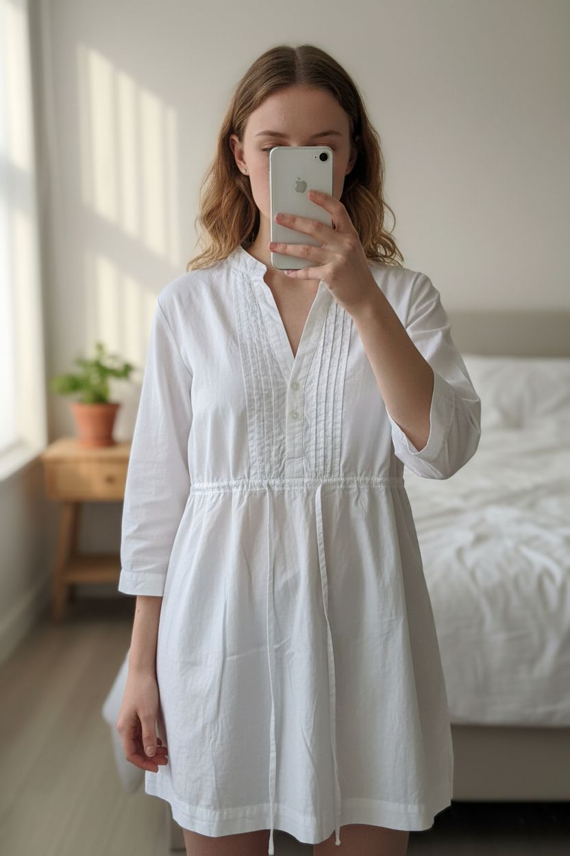 Chemisier blanc été coton tunique Mexx taille S debout, face à la caméra, dans une chambre à la lumière douce, avec une lumière naturelle filtrant par la fenêtre.