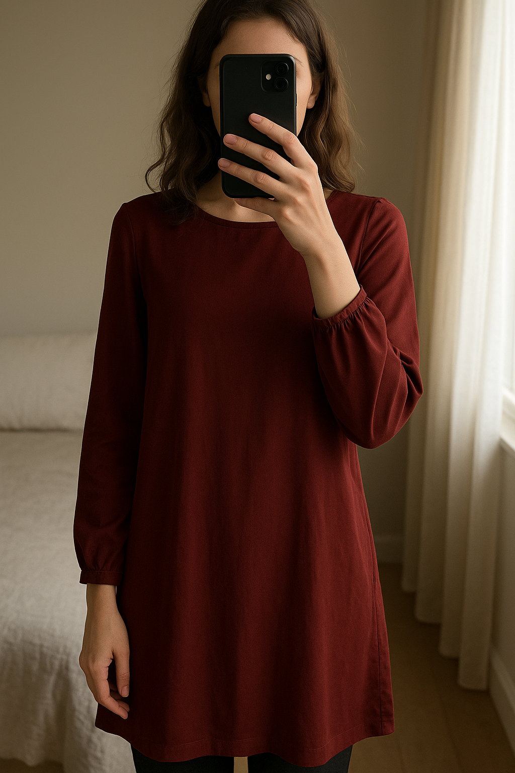 Chemisier blouse rouge bordeau taille 40 debout, face à la caméra, dans une chambre à la lumière douce, avec une lumière naturelle filtrant par la fenêtre.