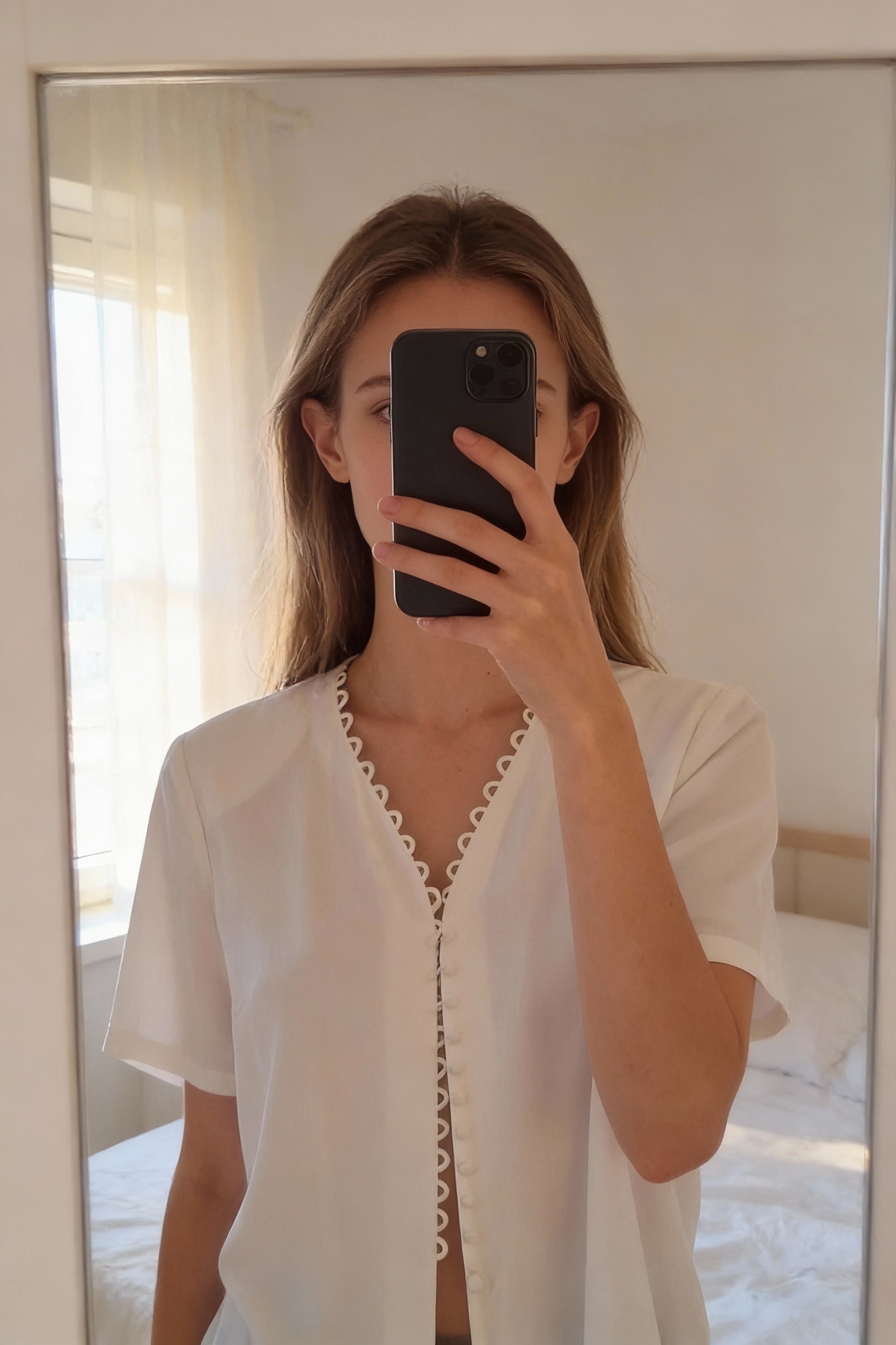 Chemisier Devernois t 48 debout, face à la caméra, dans une chambre à la lumière douce, avec une lumière naturelle filtrant par la fenêtre.