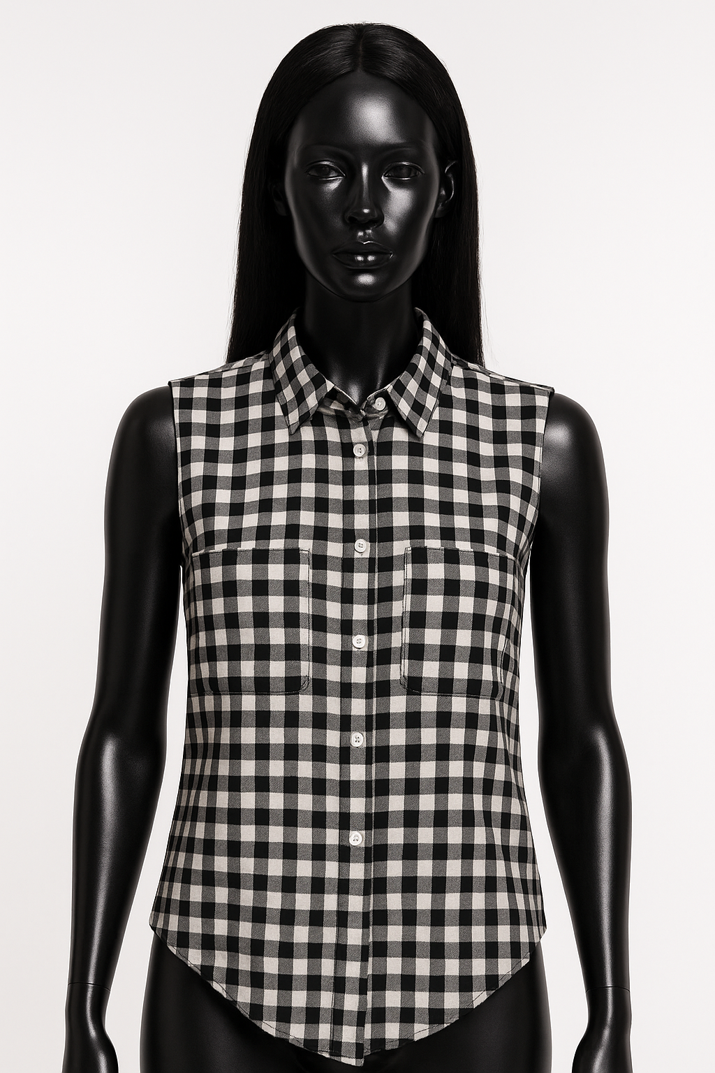 un mannequin noir brillant en plastique, sans traits du visage en Chemisier sans manches H&M à carreaux 🖤 debout, face à la caméra, dans un studio photo épuré avec fond blanc et éclairage doux.