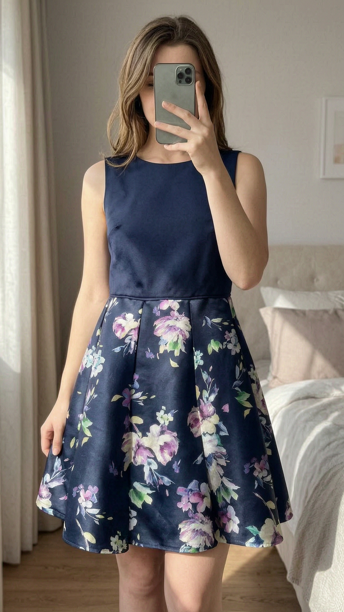 Cocktailkleid/festliches Kleid von Swing Gr. 36 aufrecht stehend, der Kamera zugewandt, in einem sanft beleuchteten Schlafzimmer, mit natürlichem Licht, das durch ein Fenster fällt.