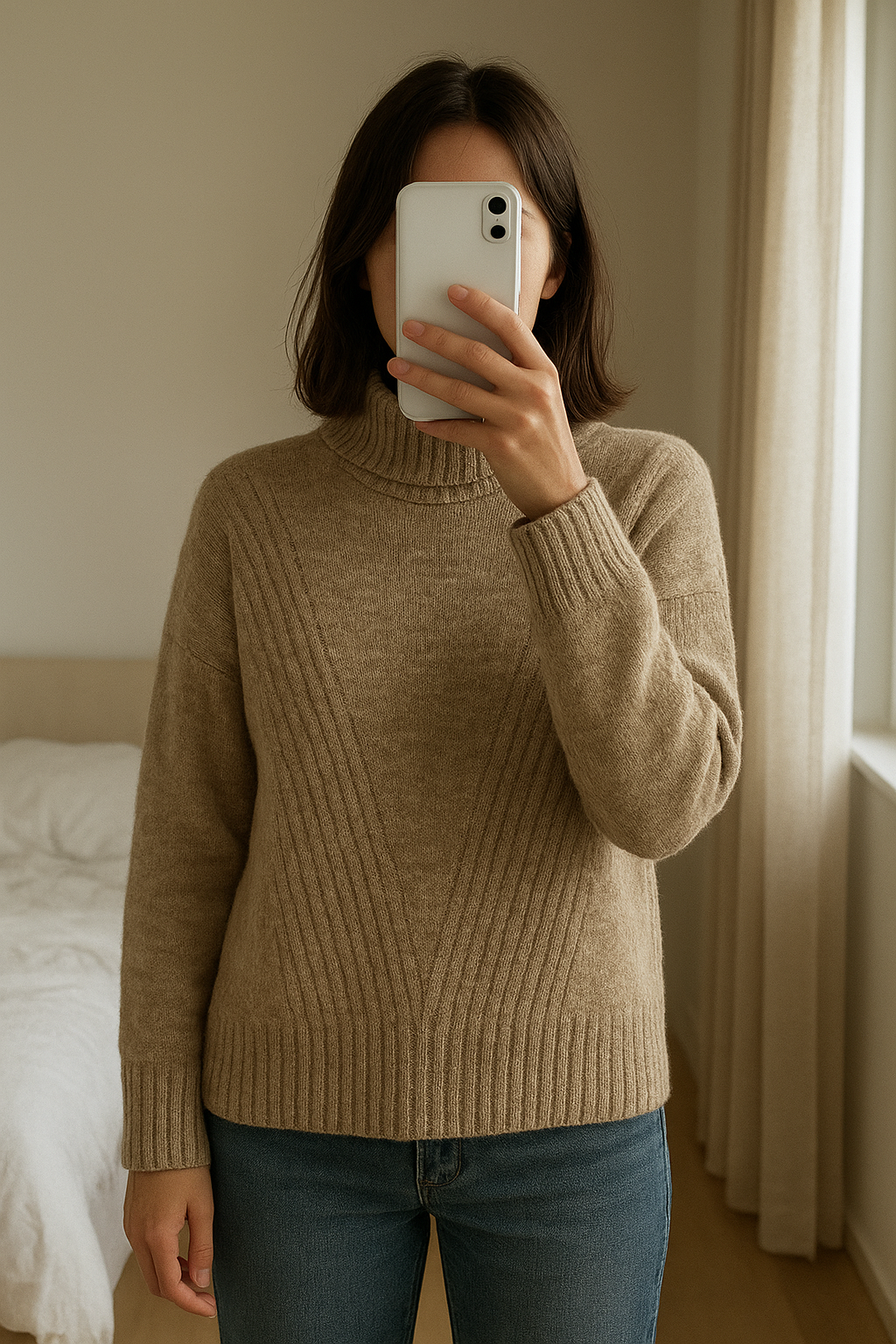 Col roulé femme debout, face à la caméra, dans une chambre à la lumière douce, avec une lumière naturelle filtrant par la fenêtre.