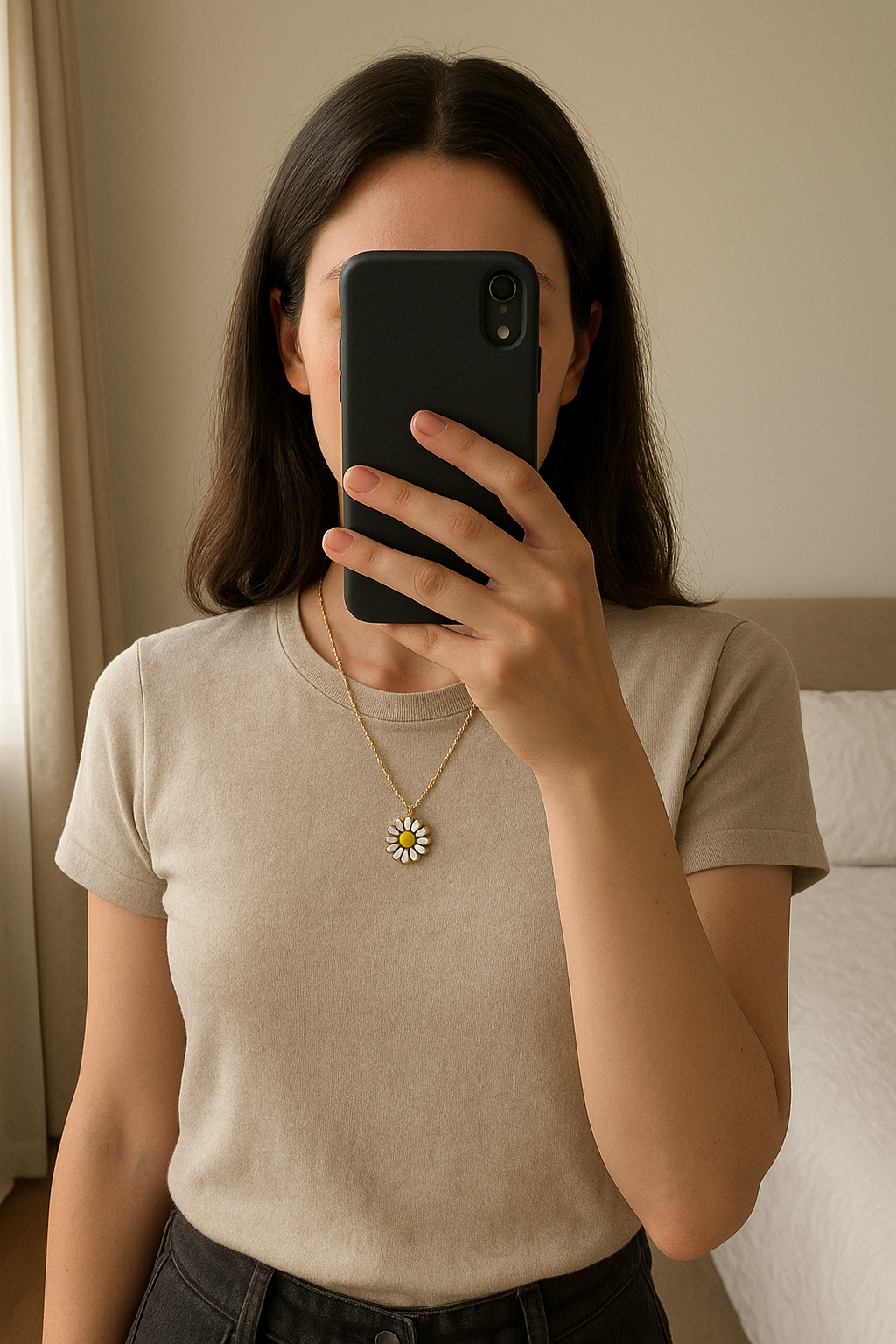 Collier femme fantaisie debout, face à la caméra, dans une chambre à la lumière douce, avec une lumière naturelle filtrant par la fenêtre.