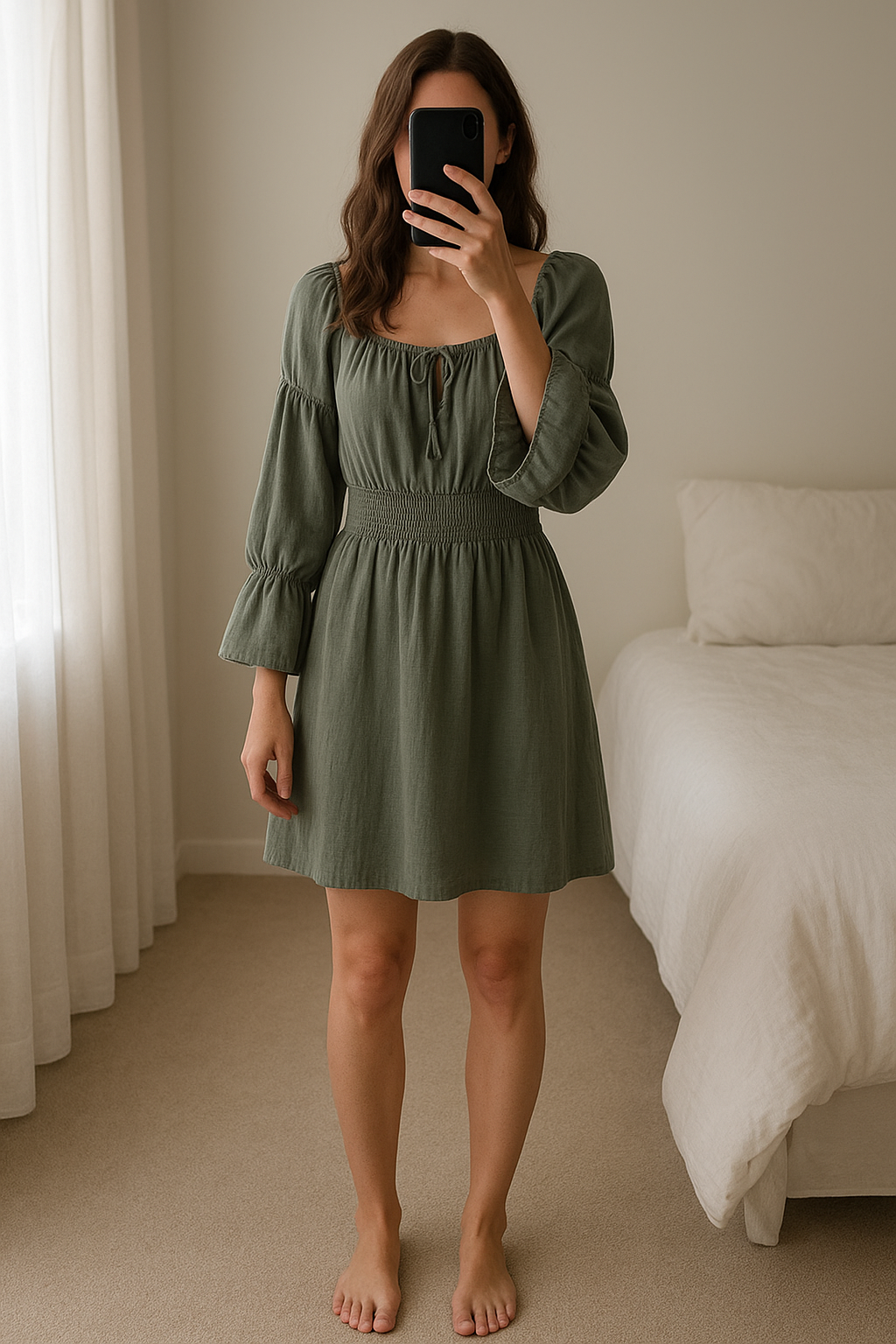Combi short debout, face à la caméra, dans une chambre à la lumière douce, avec une lumière naturelle filtrant par la fenêtre.