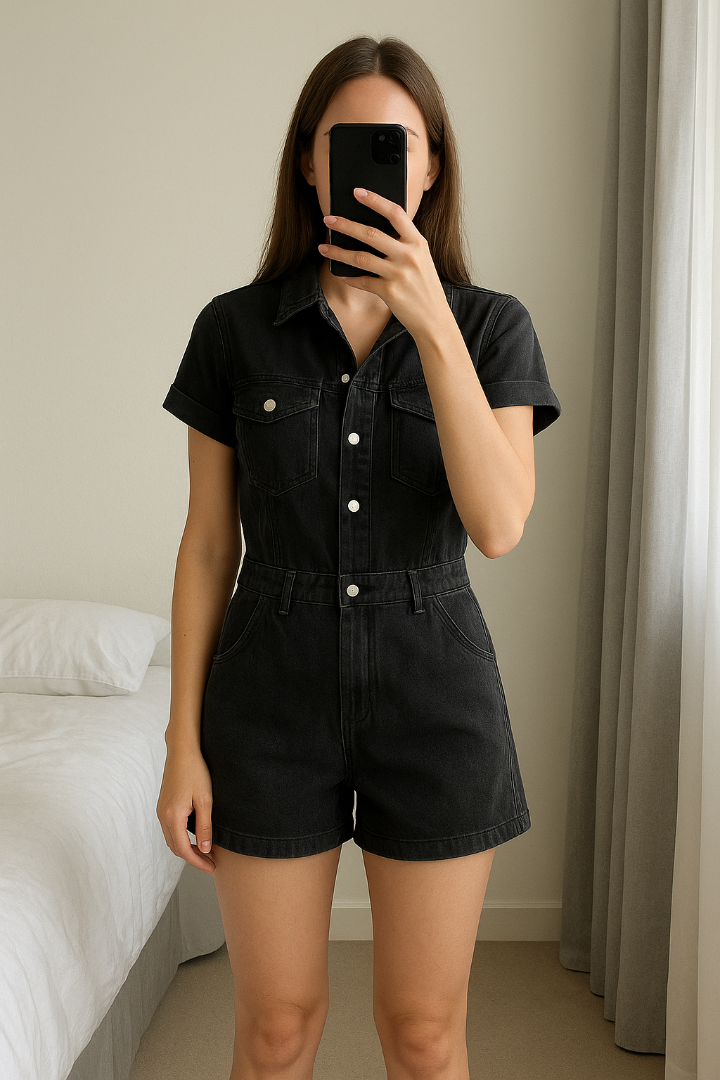 Combi short en Jean Noir 1XL debout, face à la caméra, dans une chambre à la lumière douce, avec une lumière naturelle filtrant par la fenêtre.