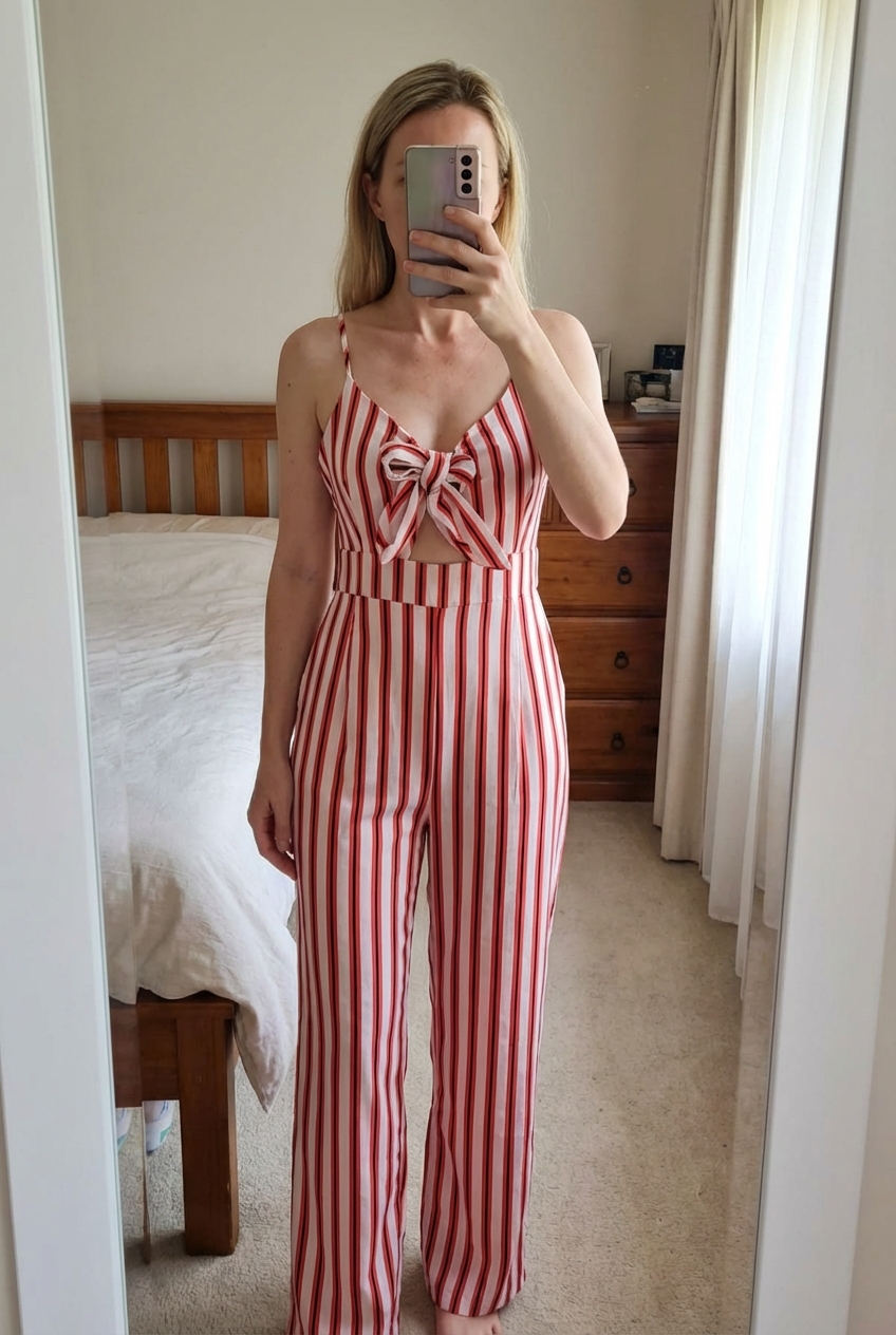 Une personne en Combinaison rayée - femme - L - Elli White debout, face à la caméra, dans une chambre à la lumière douce, avec une lumière naturelle filtrant par la fenêtre.