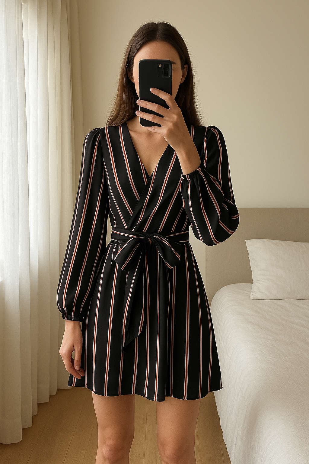 Combinaison short, Shein, XS debout, face à la caméra, dans une chambre à la lumière douce, avec une lumière naturelle filtrant par la fenêtre.