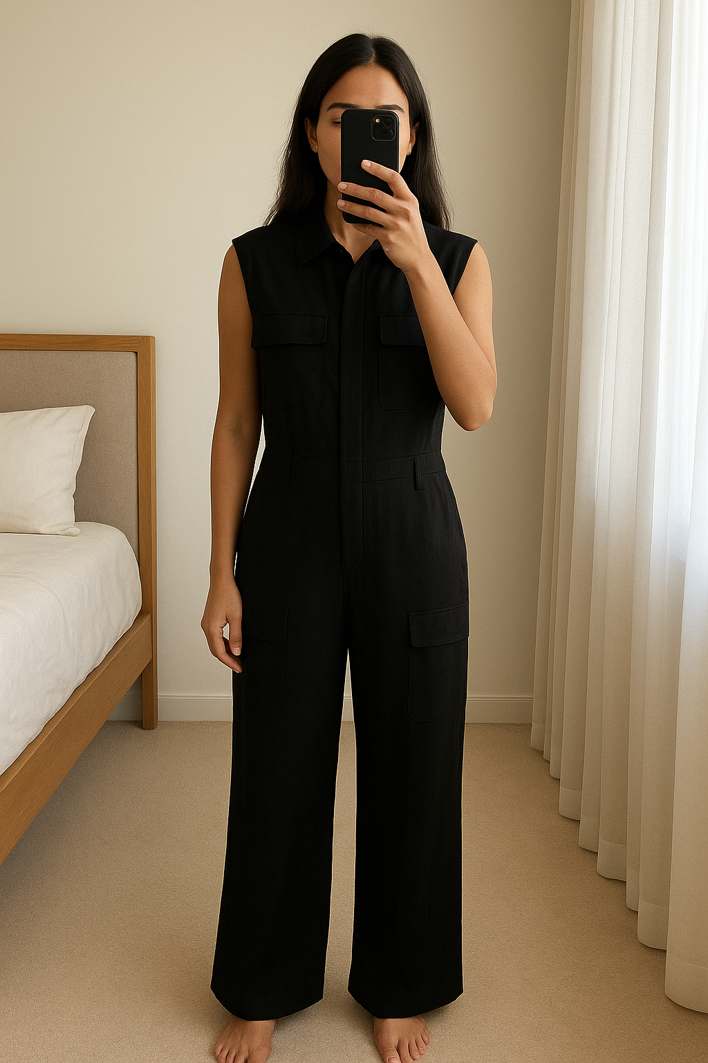 Una persona con Combinaison taille 36 / Mono talla S de pie, mirando a la cámara, en un dormitorio con luz suave y natural filtrándose por la ventana.
