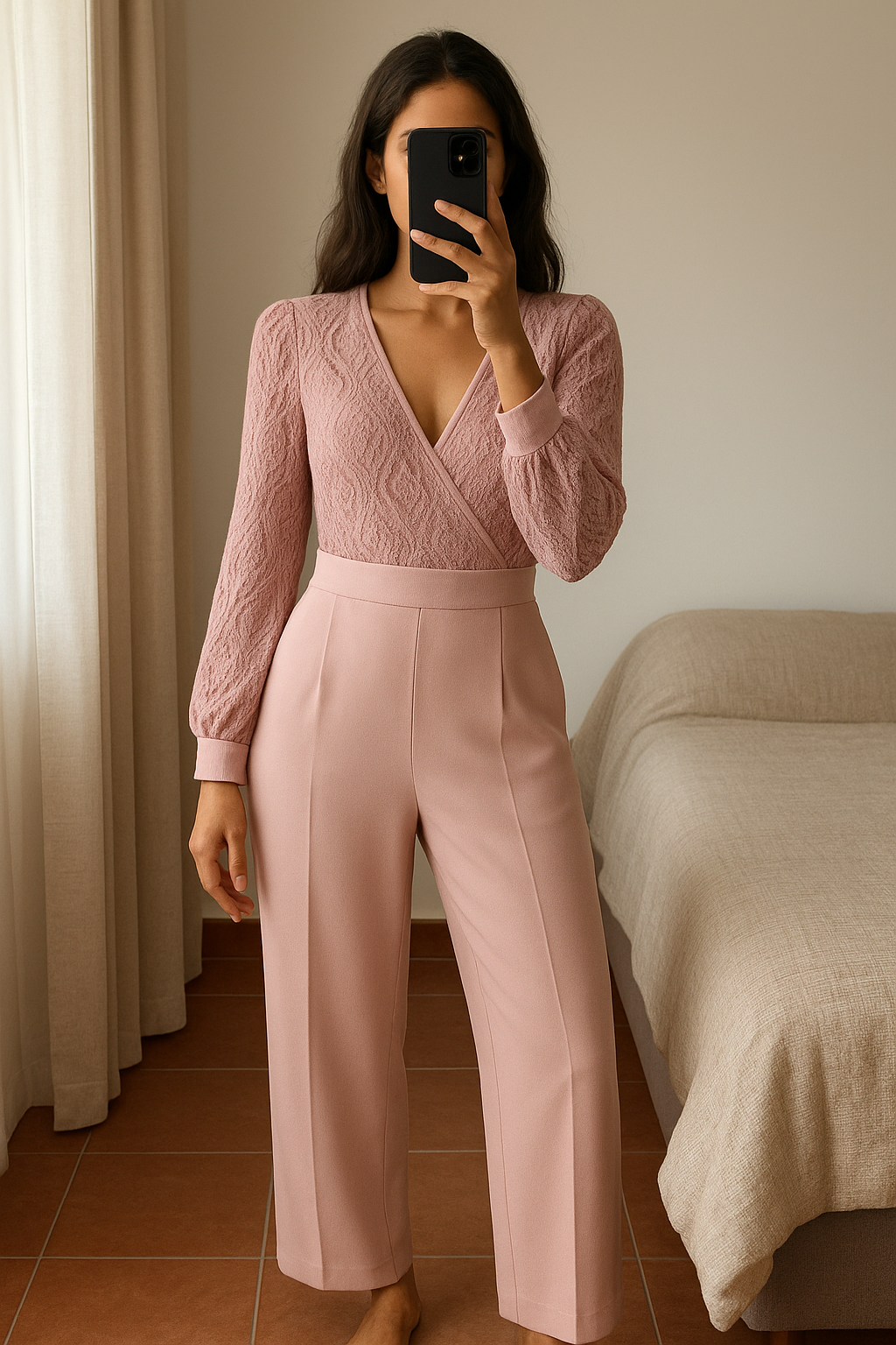 Una persona con Combinaison taille S arqueando ligeramente la espalda para una pose dinámica, en un dormitorio con luz suave y natural filtrándose por la ventana.