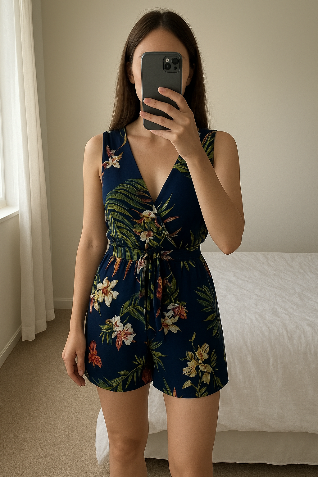 Combishort taille S de pie, mirando a la cámara, en un dormitorio con luz suave y natural filtrándose por la ventana.