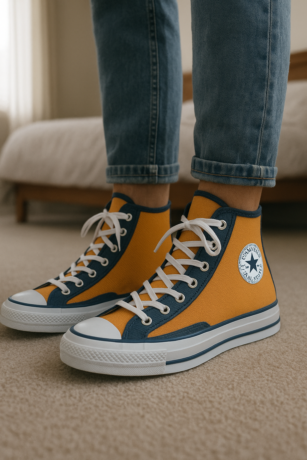 👟 Converse Chuck 70 Vintage – Pointure 35 👟 debout, face à la caméra, dans une chambre à la lumière douce, avec une lumière naturelle filtrant par la fenêtre.