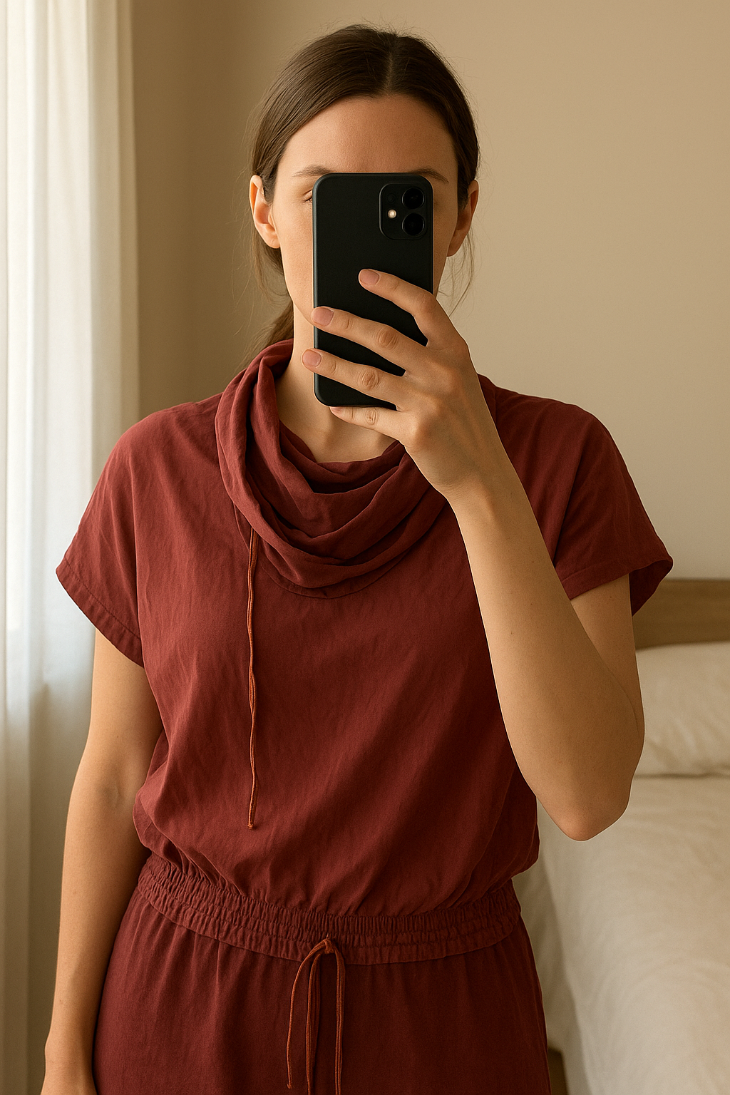 Croc top Kenzo debout, face à la caméra, dans une chambre à la lumière douce, avec une lumière naturelle filtrant par la fenêtre.