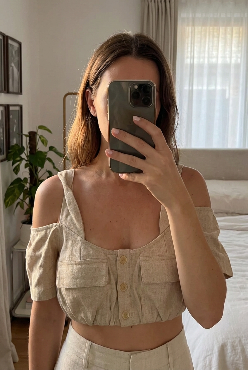 Crop Top Jacquemus 🐆 debout, face à la caméra, dans une chambre à la lumière douce, avec une lumière naturelle filtrant par la fenêtre.
