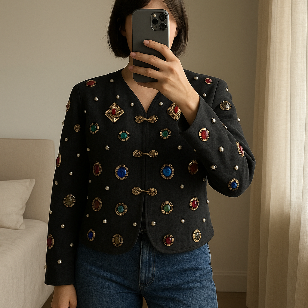 cropped blazer schwarz edelsteine aufrecht stehend, der Kamera zugewandt, in einem sanft beleuchteten Schlafzimmer, mit natürlichem Licht, das durch ein Fenster fällt.