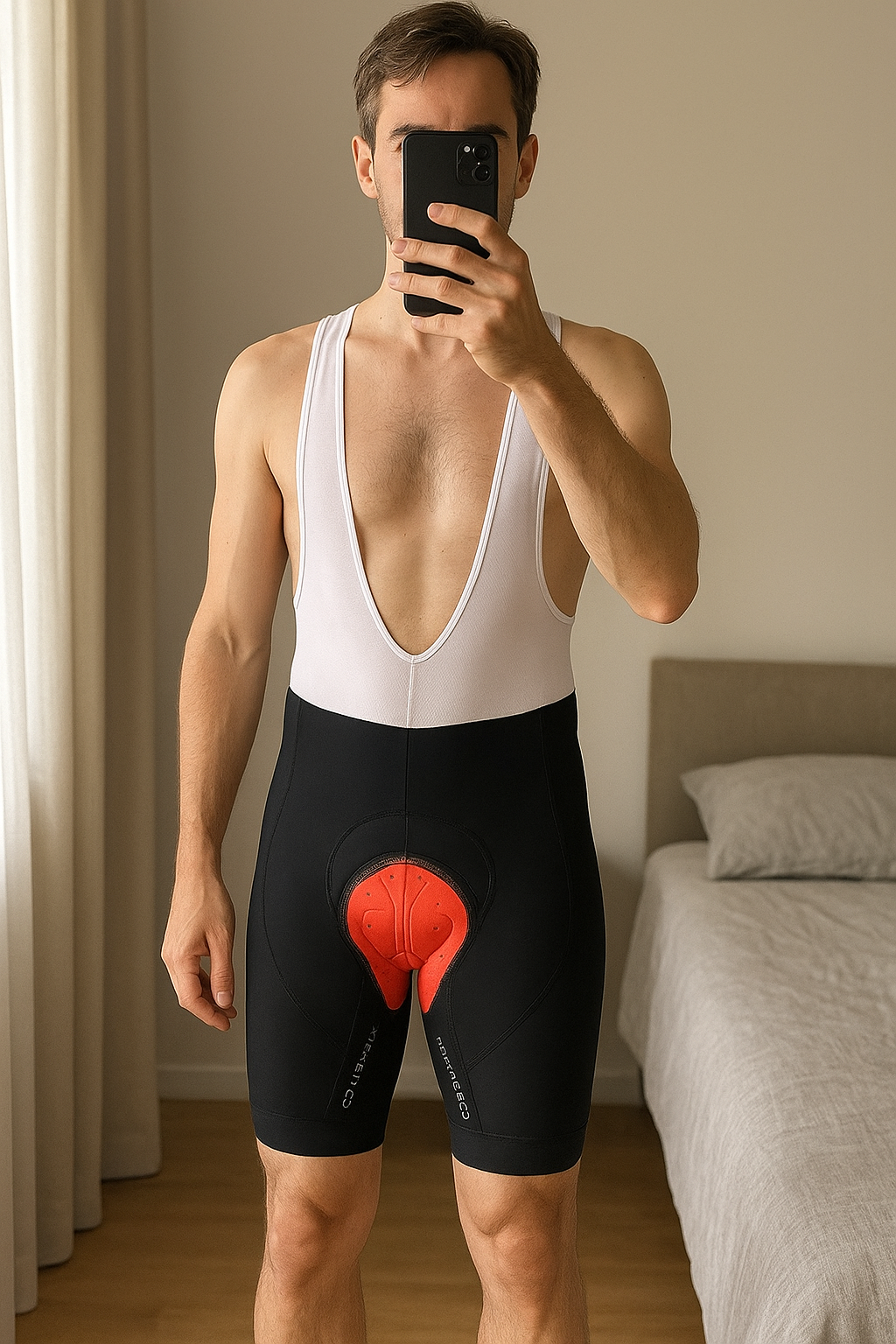 Cuissard- cycliste neuf : xxxl debout, face à la caméra, dans une chambre à la lumière douce, avec une lumière naturelle filtrant par la fenêtre.