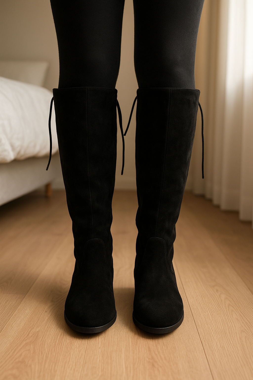 Cuissardes noires debout, face à la caméra, dans une chambre à la lumière douce, avec une lumière naturelle filtrant par la fenêtre.