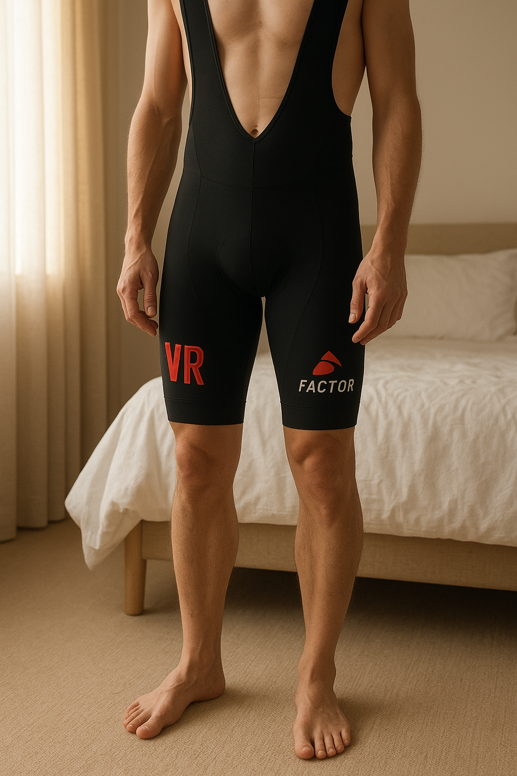 Culotte cyclisme Factor Velobici debout, face à la caméra, dans une chambre à la lumière douce, avec une lumière naturelle filtrant par la fenêtre.