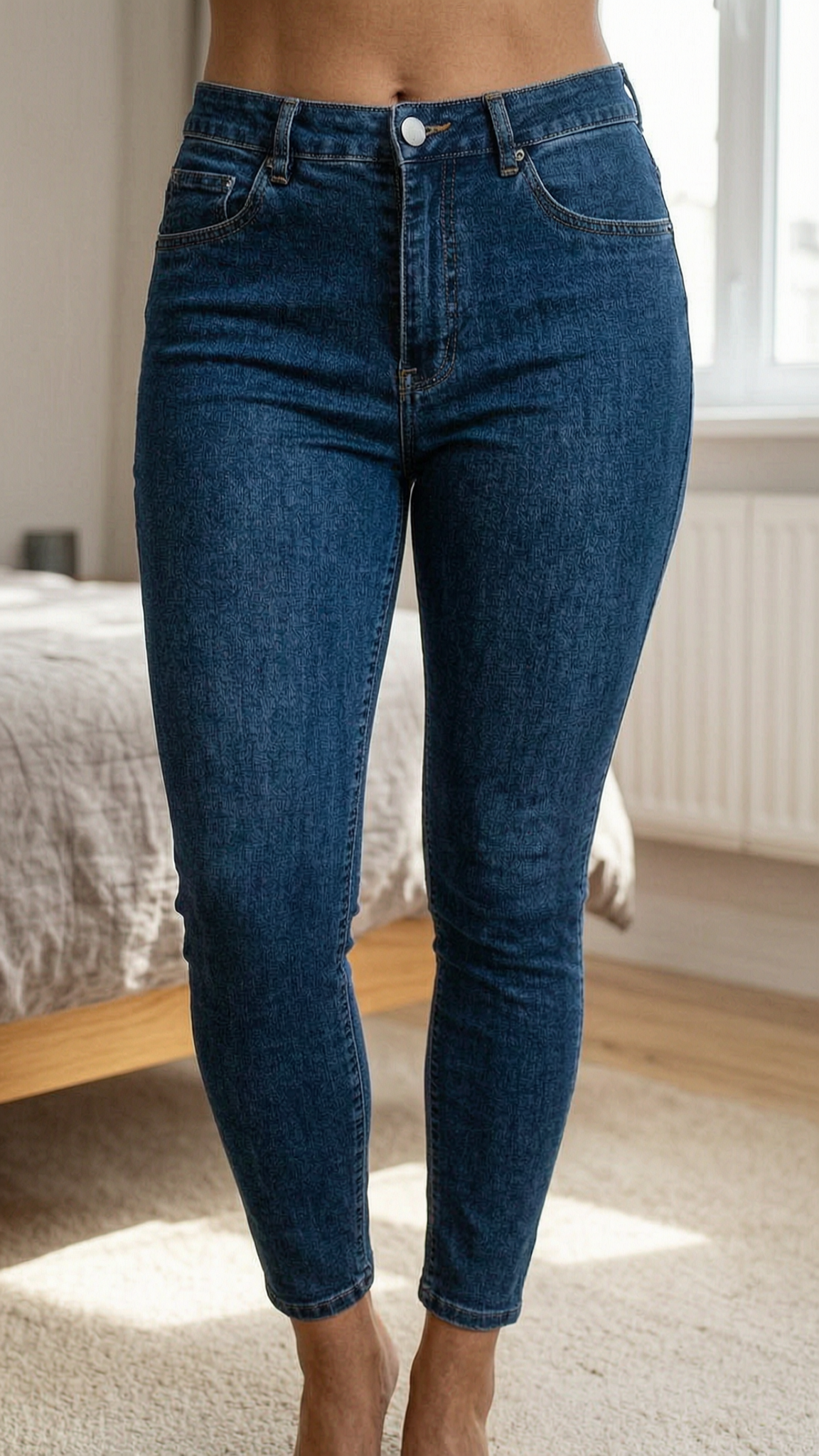 Eine Person in Curvy High Waist Jeggings Größe 42 | ultra bequem & figurbetont den Rücken leicht gewölbt für eine dynamische Pose, in einem sanft beleuchteten Schlafzimmer, mit natürlichem Licht, das durch ein Fenster fällt.