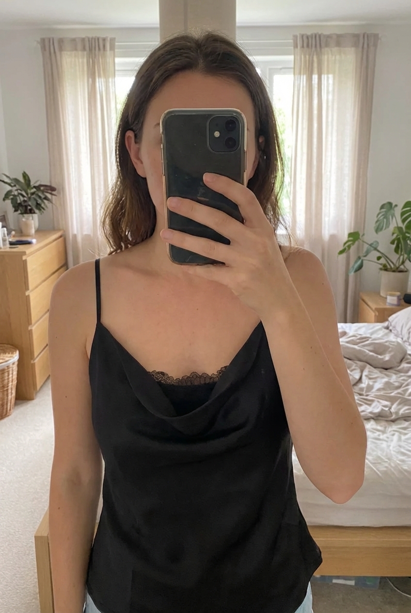 Débardeur noir avec dentelle shein debout, face à la caméra, dans une chambre à la lumière douce, avec une lumière naturelle filtrant par la fenêtre.
