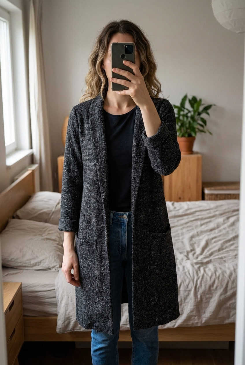Dünner Mantel Dreiviertelarm | Gr. 32 aufrecht stehend, der Kamera zugewandt, in einem sanft beleuchteten Schlafzimmer, mit natürlichem Licht, das durch ein Fenster fällt.