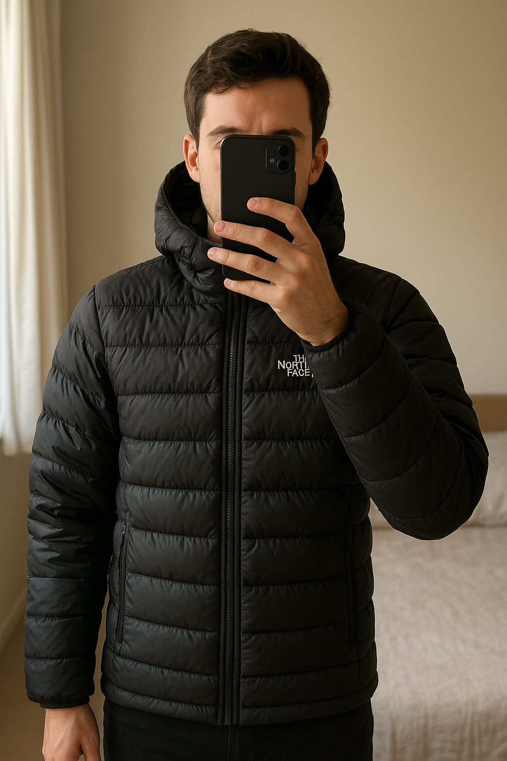 Doudou the north face taille M debout, face à la caméra, dans une chambre à la lumière douce, avec une lumière naturelle filtrant par la fenêtre.