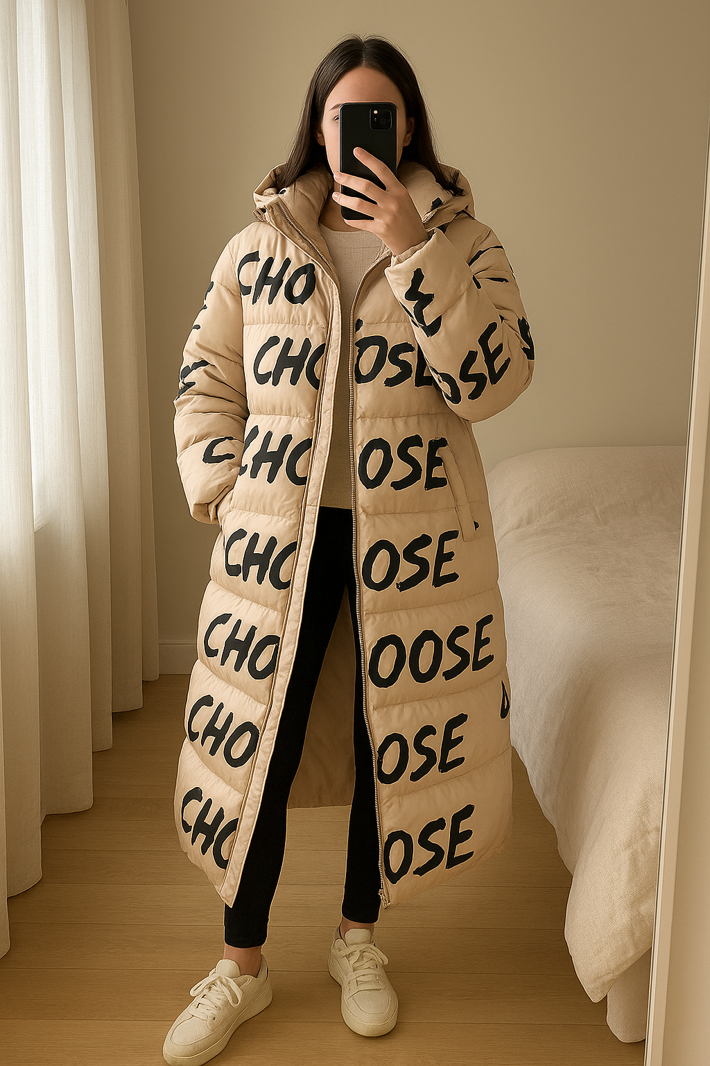 Doudoune debout, face à la caméra, dans une chambre à la lumière douce, avec une lumière naturelle filtrant par la fenêtre.