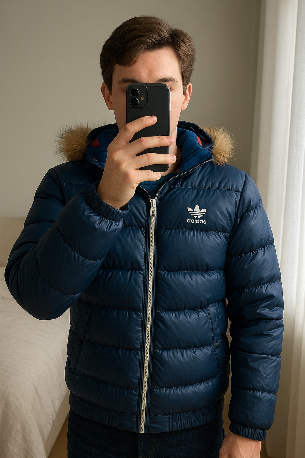Doudoune Adidas debout, face à la caméra, dans une chambre à la lumière douce, avec une lumière naturelle filtrant par la fenêtre.