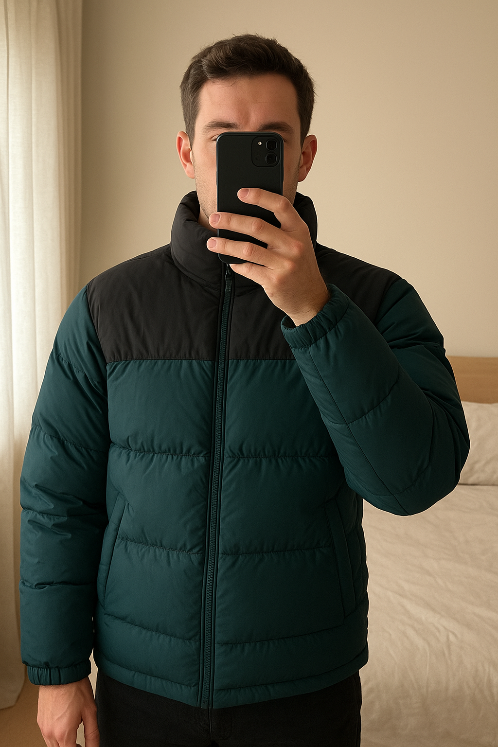 Doudoune Bizzbee – Taille L – Noir & Vert – Neuve debout, face à la caméra, dans une chambre à la lumière douce, avec une lumière naturelle filtrant par la fenêtre.