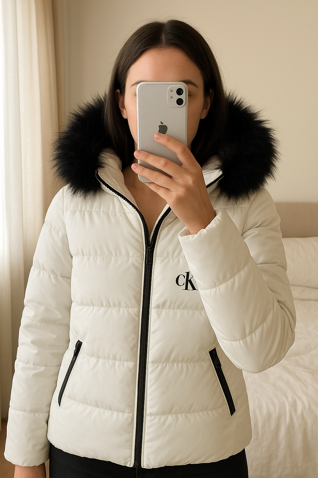 Doudoune Calvin Klein debout, face à la caméra, dans une chambre à la lumière douce, avec une lumière naturelle filtrant par la fenêtre.