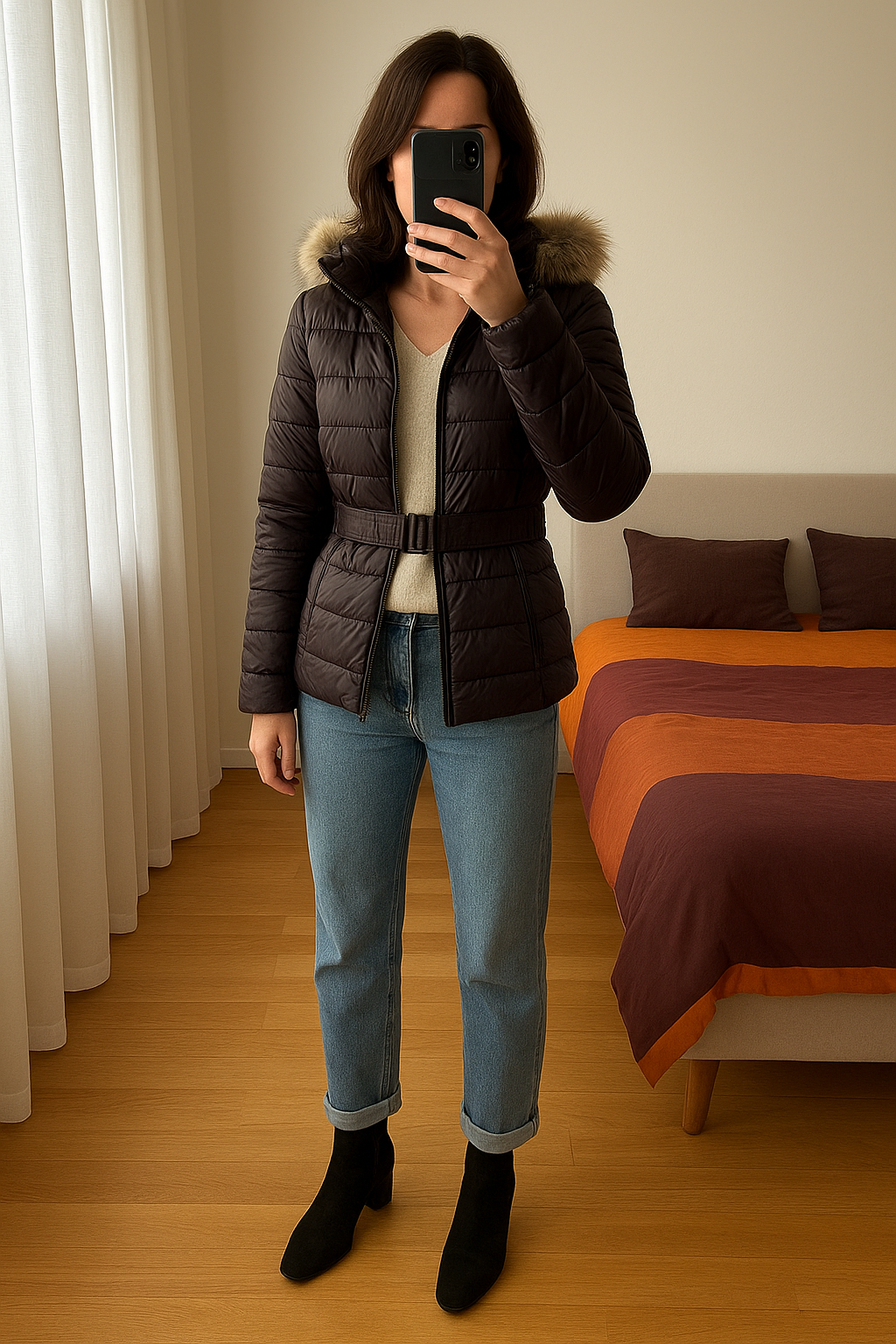 🌺 Doudoune femme Taille S neuf, manteau femme 🌺 debout, face à la caméra, dans une chambre à la lumière douce, avec une lumière naturelle filtrant par la fenêtre.