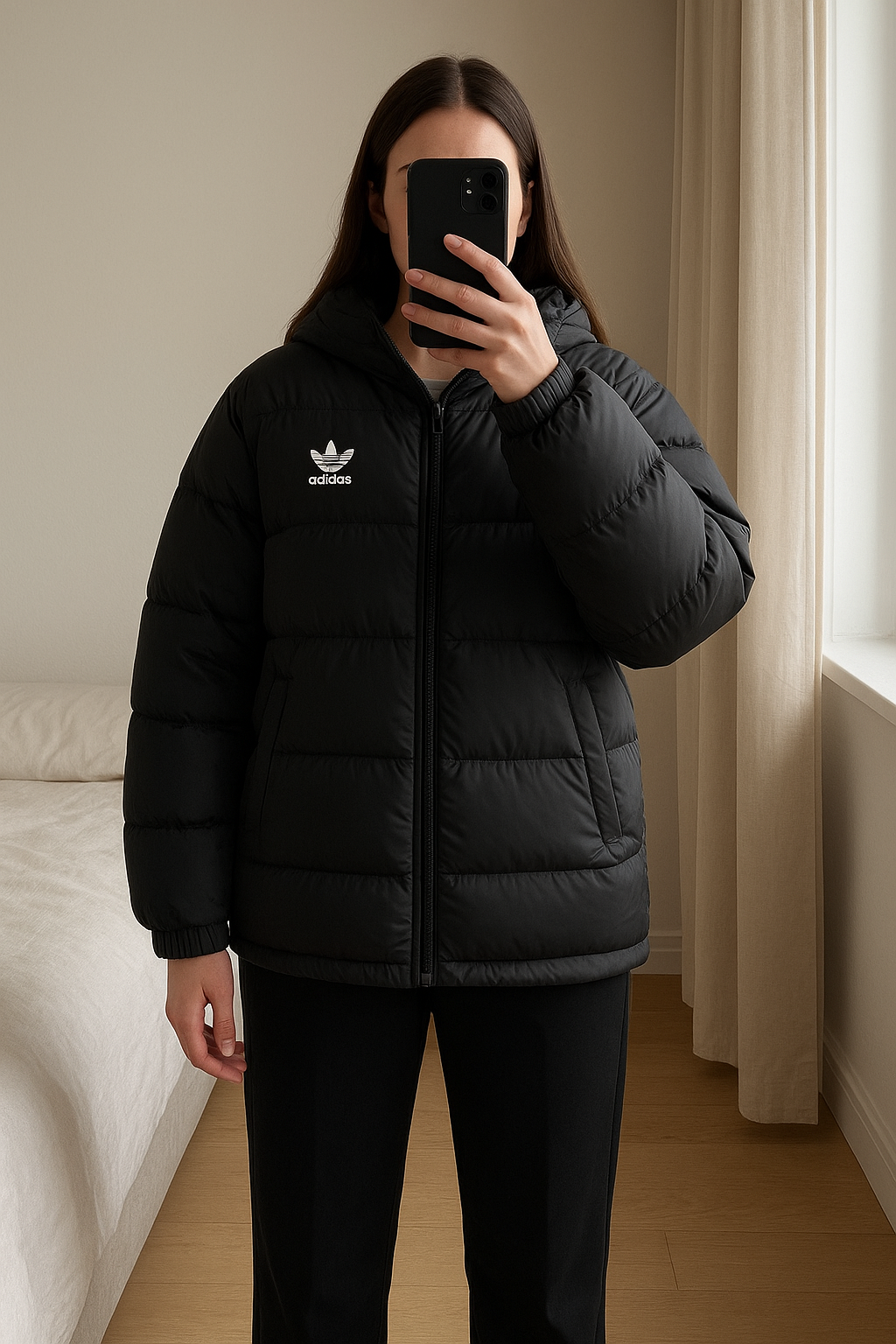 Doudoune longue adidas debout, face à la caméra, dans une chambre à la lumière douce, avec une lumière naturelle filtrant par la fenêtre.
