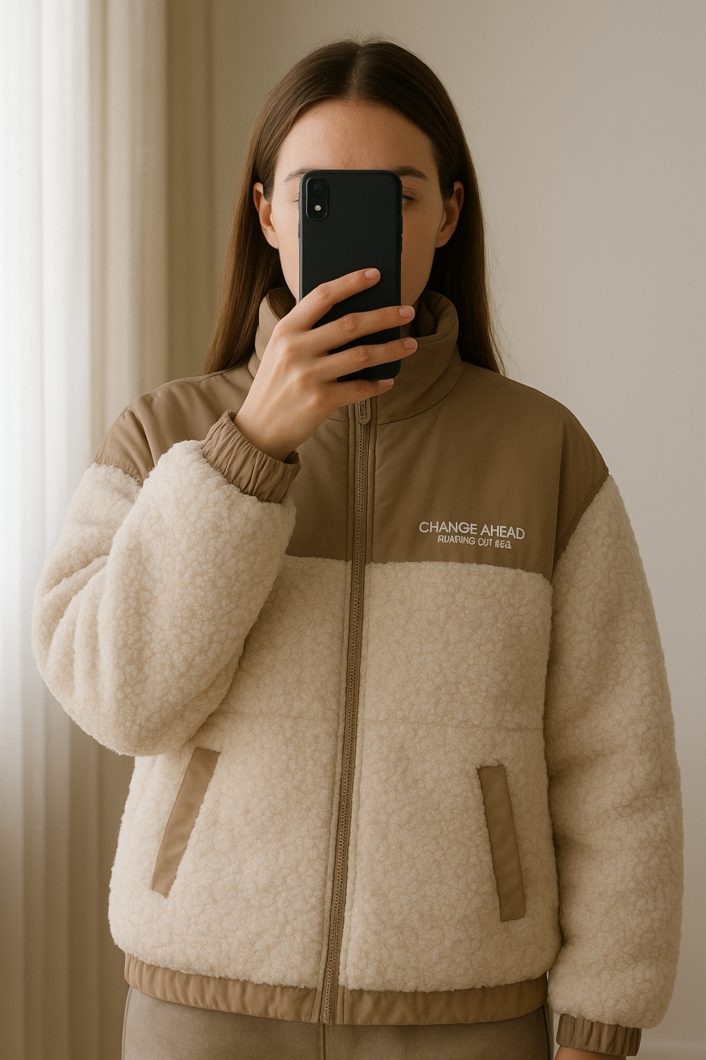 Doudoune mi toile mi mouton debout, face à la caméra, dans une chambre à la lumière douce, avec une lumière naturelle filtrant par la fenêtre.