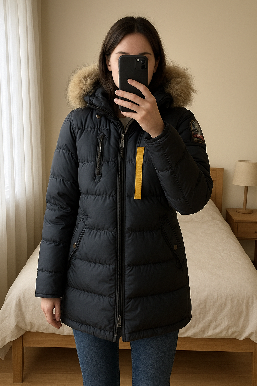 Doudoune PJS debout, face à la caméra, dans une chambre à la lumière douce, avec une lumière naturelle filtrant par la fenêtre.