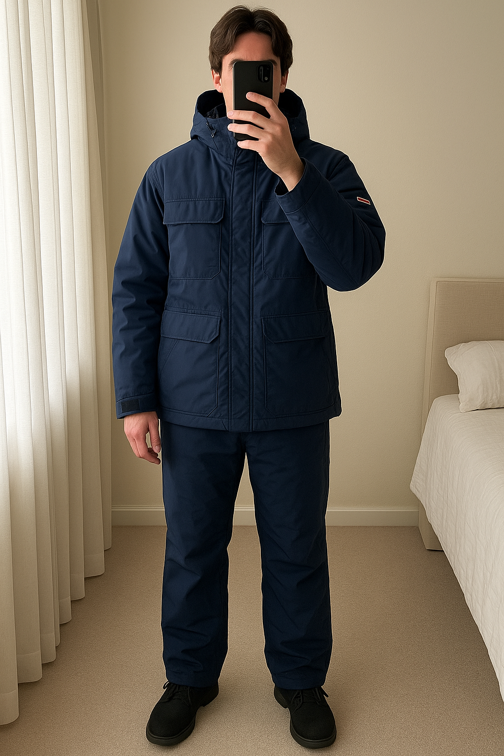 Doudoune Tommy Hilfiger debout, face à la caméra, dans une chambre à la lumière douce, avec une lumière naturelle filtrant par la fenêtre.