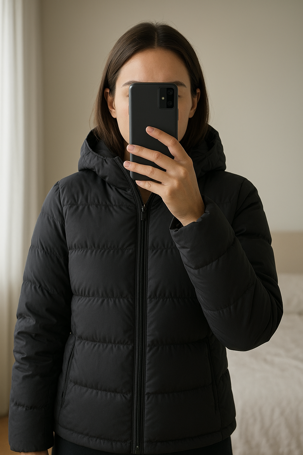🧥 Doudoune Uniqlo noire – Taille XS – Capuche intégrée 🧥 debout, face à la caméra, dans une chambre à la lumière douce, avec une lumière naturelle filtrant par la fenêtre.