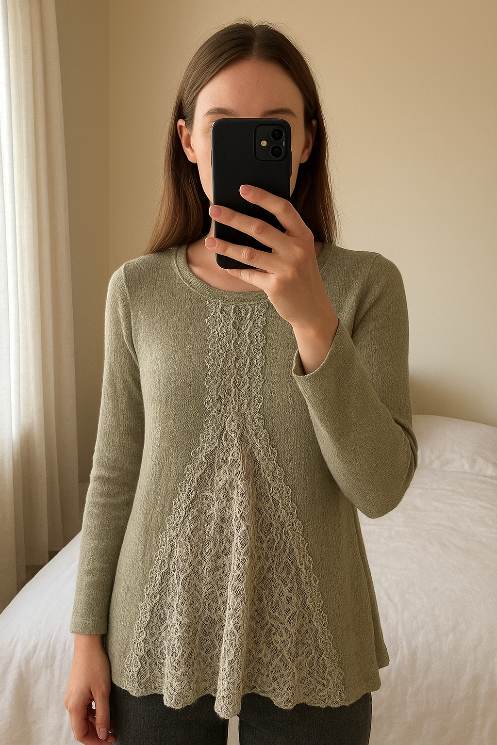 Dress em pé, de frente para a câmera, em um quarto com iluminação suave e luz natural filtrando pela janela.