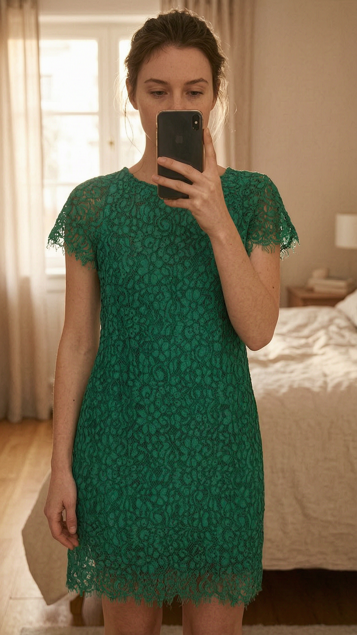 Dunkelgrünes Spitzenkleid von Zara Gr. XS aufrecht stehend, der Kamera zugewandt, in einem sanft beleuchteten Schlafzimmer, mit natürlichem Licht, das durch ein Fenster fällt.