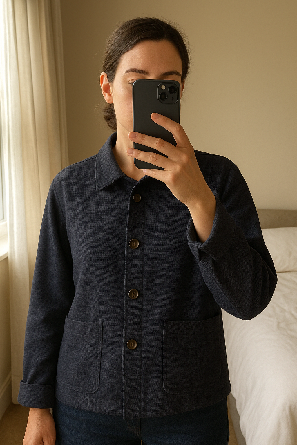 Emma Willis size 18 tall black box jacket standing straight facing the camera, in a softly lit bedroom setting, with gentle natural light filtering through a window.