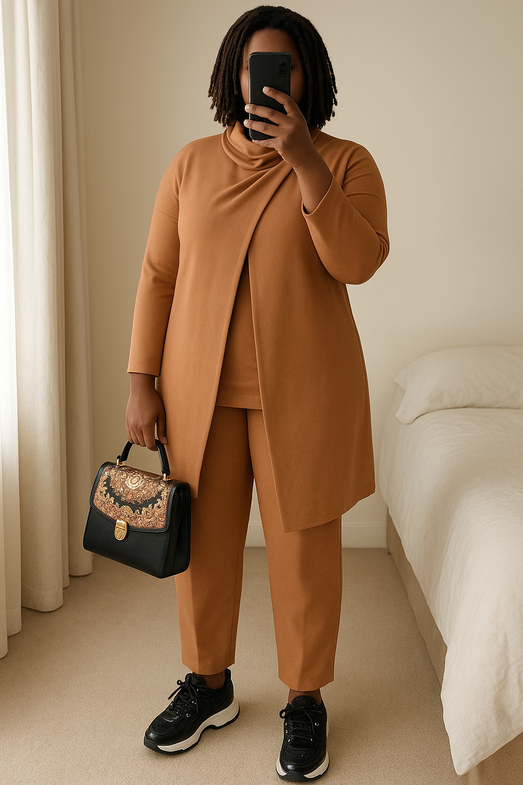 Ensemble chic tunique croisé-pantalon debout, face à la caméra, dans une chambre à la lumière douce, avec une lumière naturelle filtrant par la fenêtre.