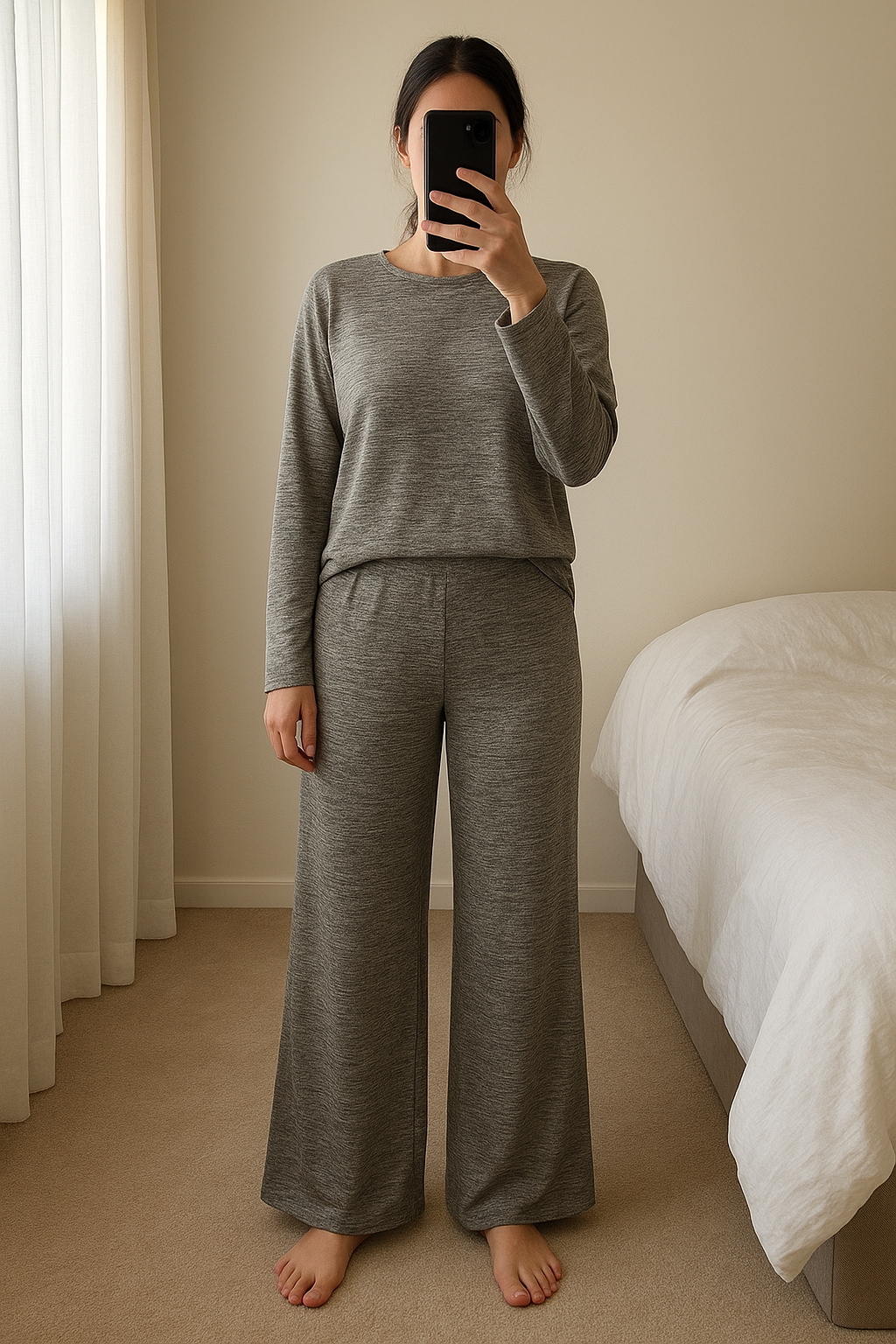 Ensemble cozy gris - Code debout, face à la caméra, dans une chambre à la lumière douce, avec une lumière naturelle filtrant par la fenêtre.